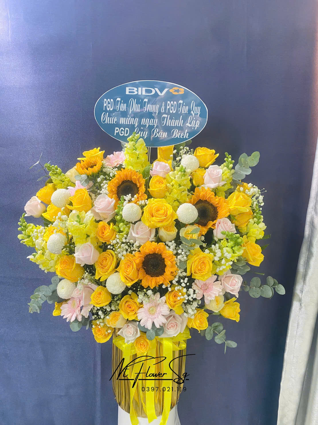 - Thành Phần Hoa: • Hướng dương: Tượng trưng cho thành công, vươn xa • Hoa hồng vàng & pastel: Gửi lời chúc may mắn, thịnh vượng • Cát tường, mẫu đơn, đồng tiền, baby trắng: Tăng thêm sự tinh tế, sang trọng Tất cả được phối màu hài hòa, kết hợp cùng nơ ruy băng vàng nổi bật, tạo ấn tượng mạnh mẽ và chuyên nghiệp.
